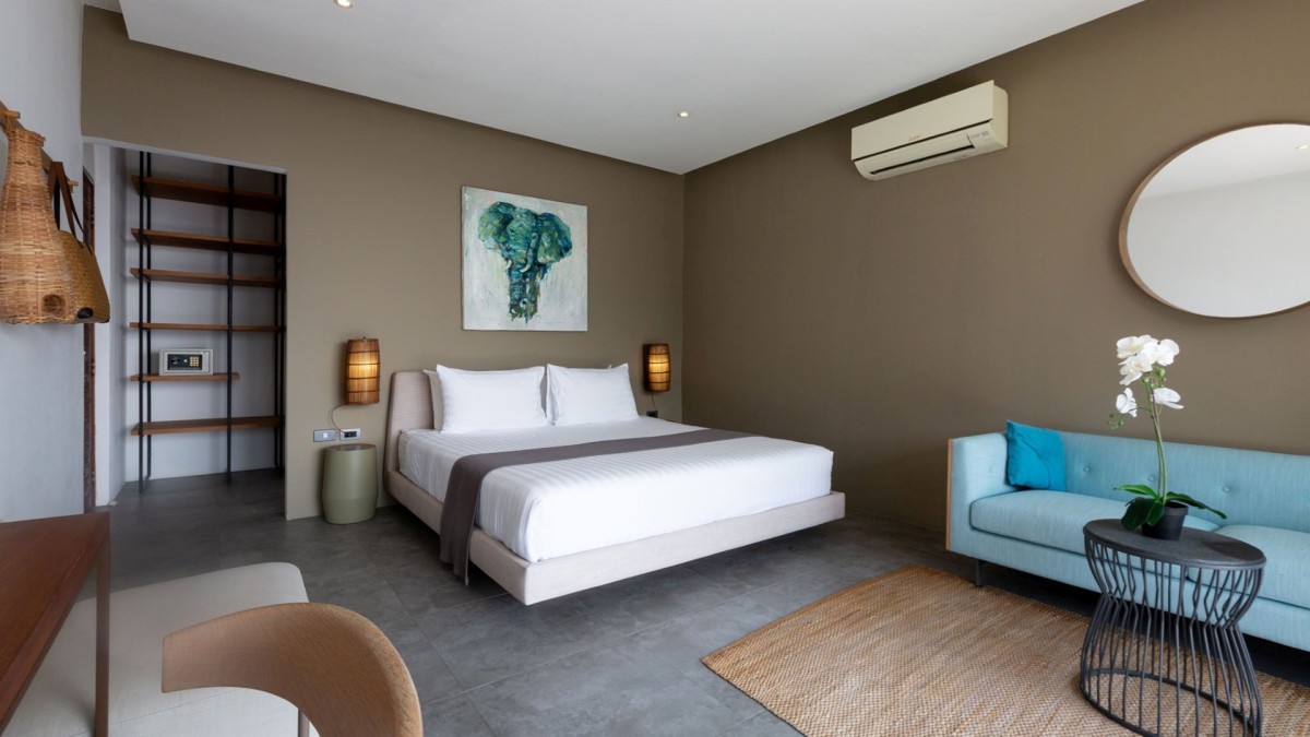 Bedroom 6: Bedroom with a king-size bed, A/C, WiFi, safe, sofa, terrace, beach and garden view, and en-suite bathroom with rain shower, vanity and separate WC. 2 guests maximum