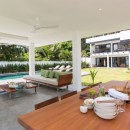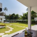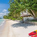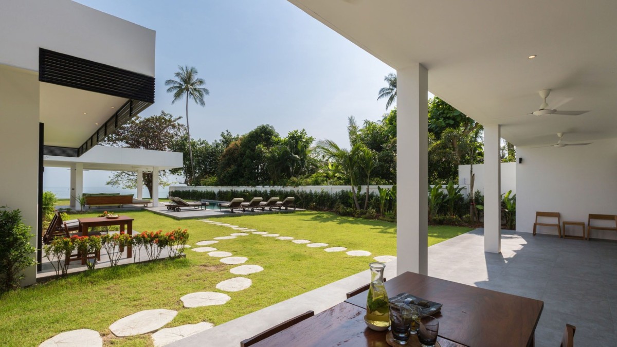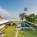 The villa’s expansive lawned garden stretches right to the water’s edge, where a 7.5-metre swimming pool offers the perfect place to cool off. On either side of the garden, two separate beachfront pavilions house four more ensuite double bedrooms, each with views of the beach or lush garden.