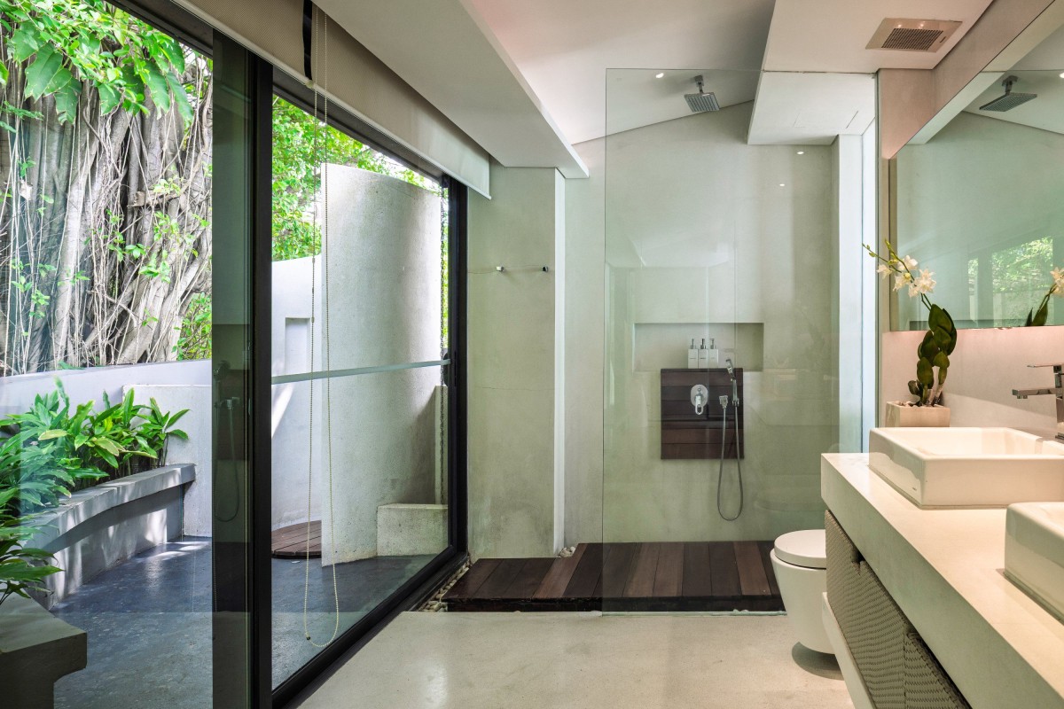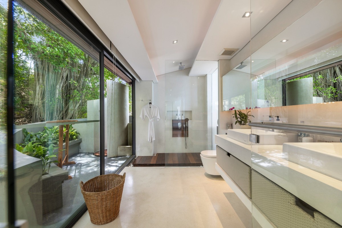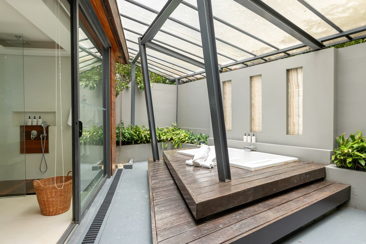 Bedroom 1: Master bedroom with a king-size bed, ceiling fan, A/C, TV, WiFi, safe, walk-in closet, sea view, private terrace, and en-suite bathroom with outdoor bathtub, shower, double vanity and WC. 2 guests maximum