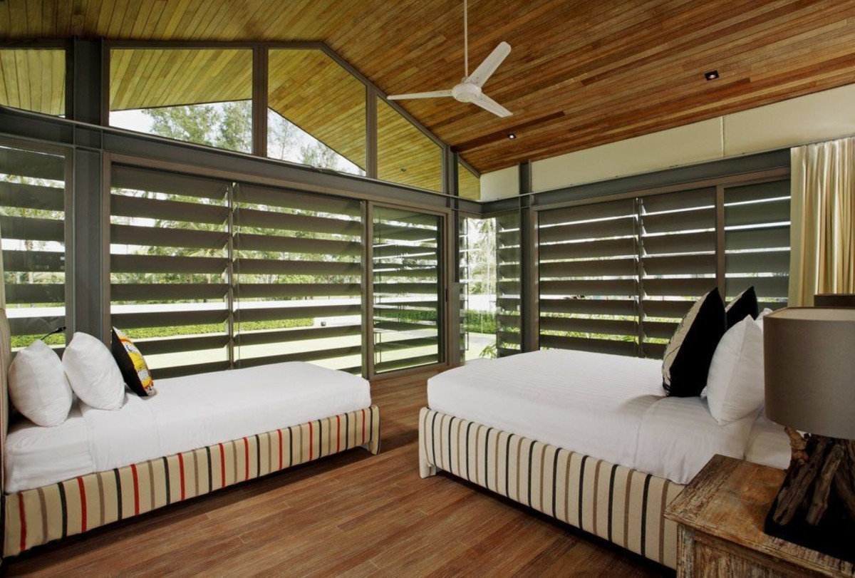 Bedroom 3: Bedroom with two single beds (can be made up as a king-size bed), WiFi, A/C, ceiling fans, pool view, and shared bathroom (with bedroom 4) with bathtub, shower, double vanity, bidet, and WC. 2 guests maximum