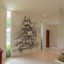 The open-plan living area features a comfortable lounge, a dining table for eight, and a modern kitchen with a breakfast bar overlooking the pool, all designed in cool white and grey tones for a clean, contemporary feel. Guests are welcomed through an elegant entry hall, where a dramatic mural and Zen rock garden set the tone for the villa’s sophisticated yet tranquil aesthetic.