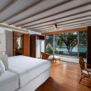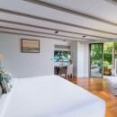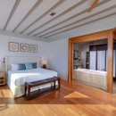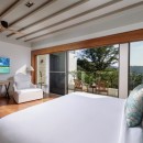 Bedroom 6: Lower level bedroom with king-size bed, TV, WiFi, A/C, ceiling fan, working desk, ocean and garden view, access to terrace, access to garden, and en-suite bathroom with bathtub, rain shower, shower, double vanity, and separate WC with bidet. 2 guests maximum