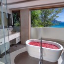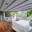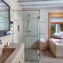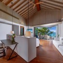 Bedroom 5: Lower level bedroom with king-size bed, WiFi, A/C, ceiling fan, working desk, ocean and garden view, access to balcony (Shared with bedroom 4), and en-suite bathroom with bathtub, rain shower, shower, double vanity, and separate WC. 2 guests maximum