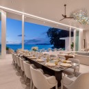 The fully equipped commercial kitchen and large dining area—with seating for up to 16—are ideal for shared meals, whether prepared by guests or the villa’s professional staff. Outside, landscaped gardens lead directly to the soft sands, offering a seamless connection to the sea.