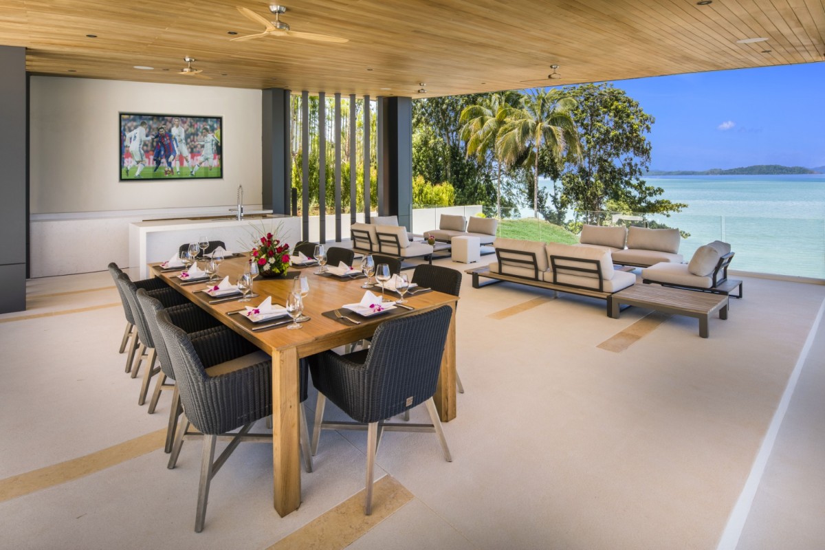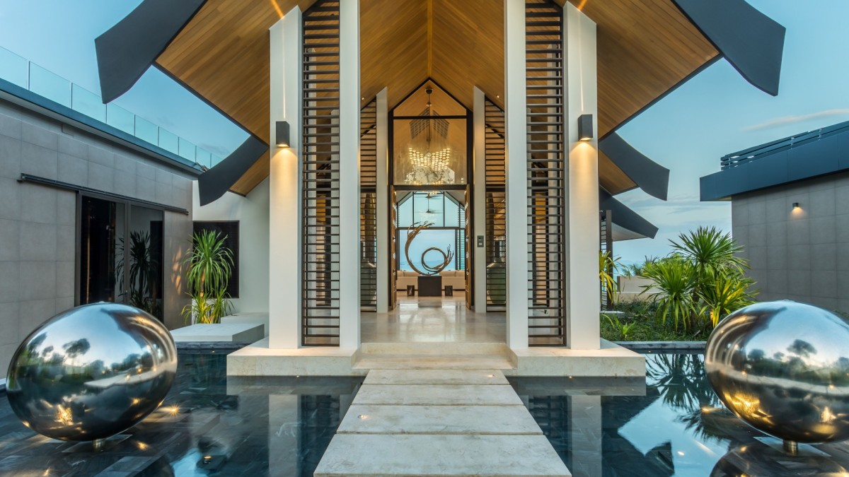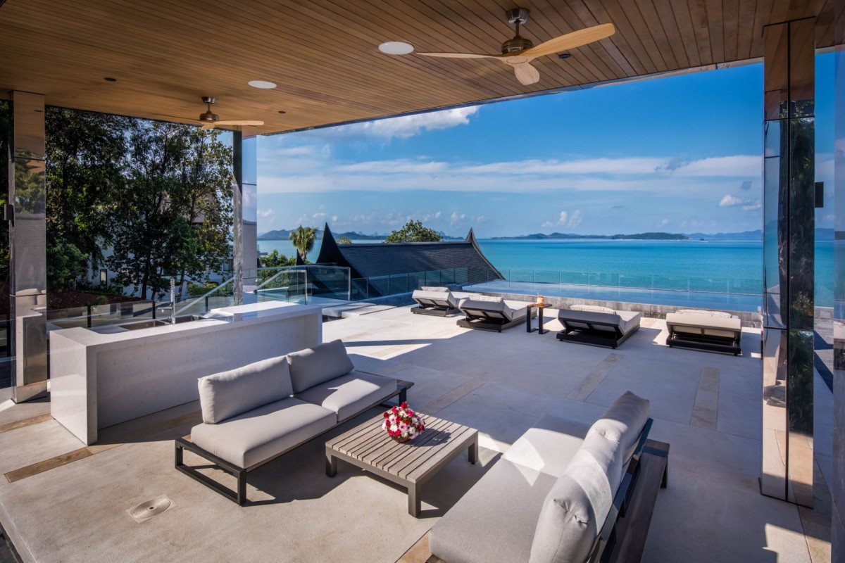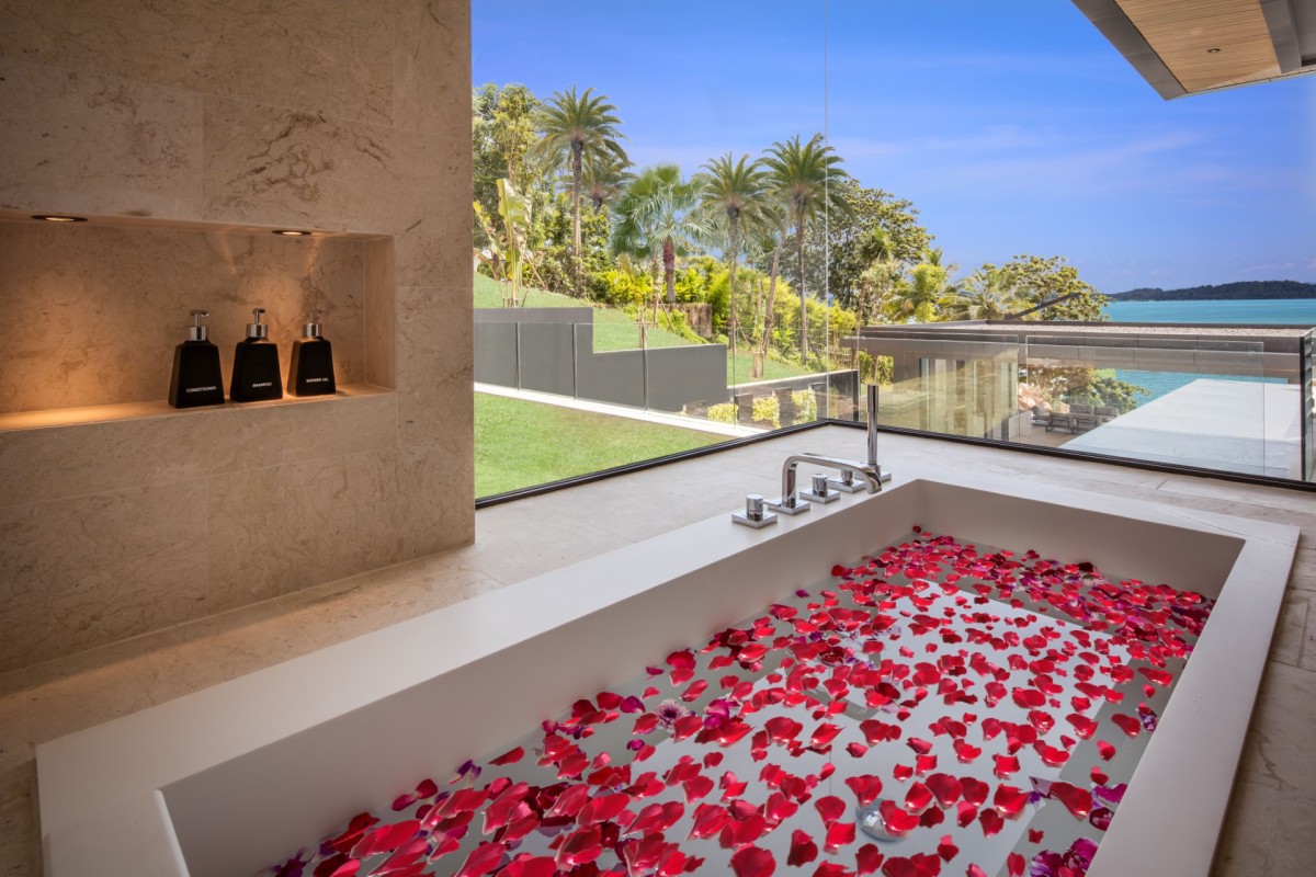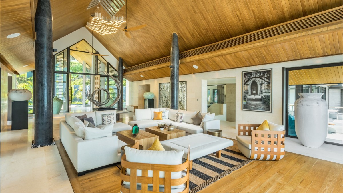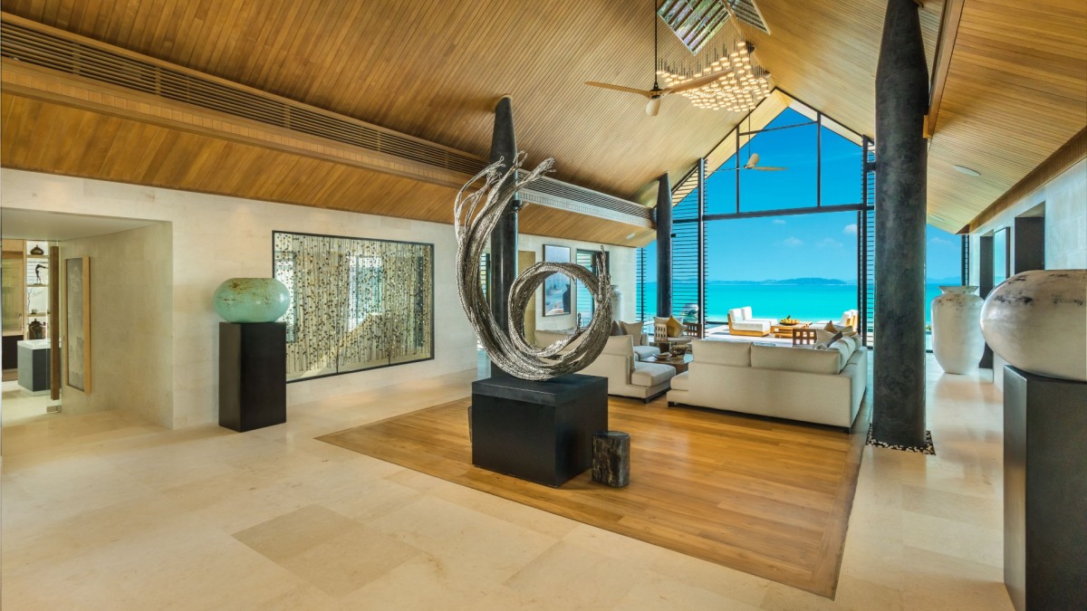 From the moment you arrive, Villa Amaravida makes an impression. Its beautifully arched entrance sets the tone for the elegance within, opening to a grand living area with soaring ceilings and exquisite design details. A dramatic floor-to-ceiling window frames sweeping views of the outdoor lounge and the sparkling Andaman Sea, offering a truly breathtaking welcome.