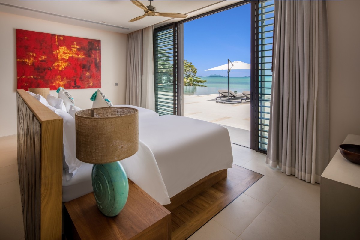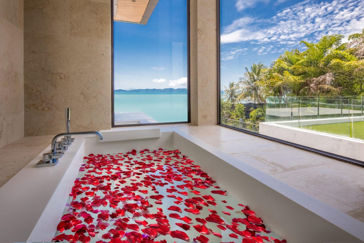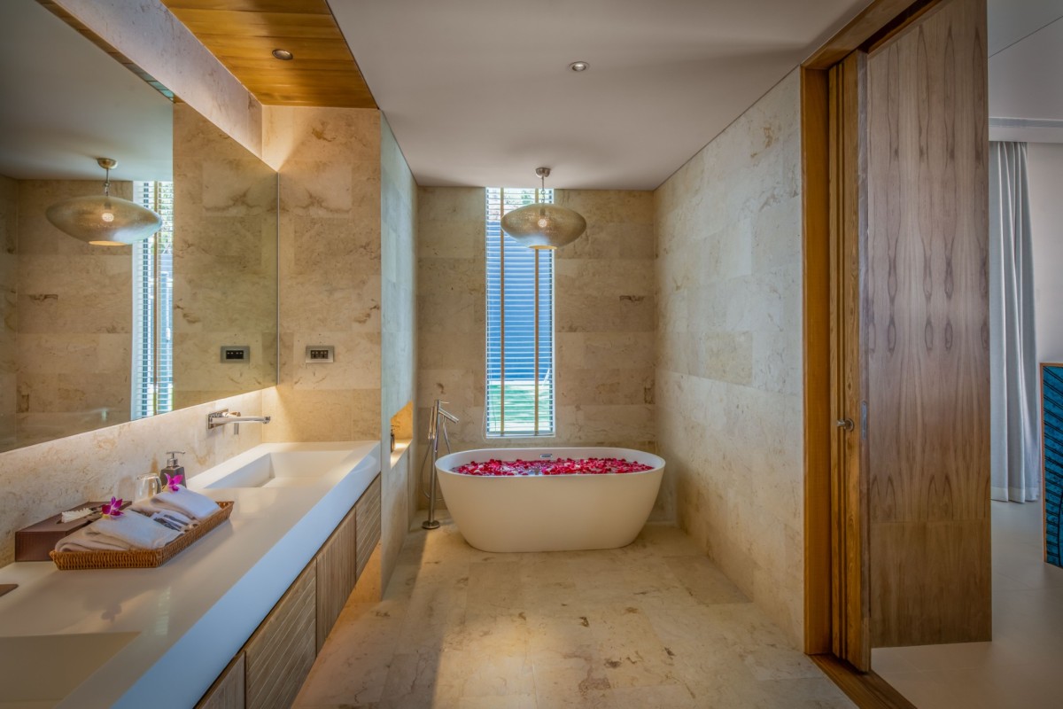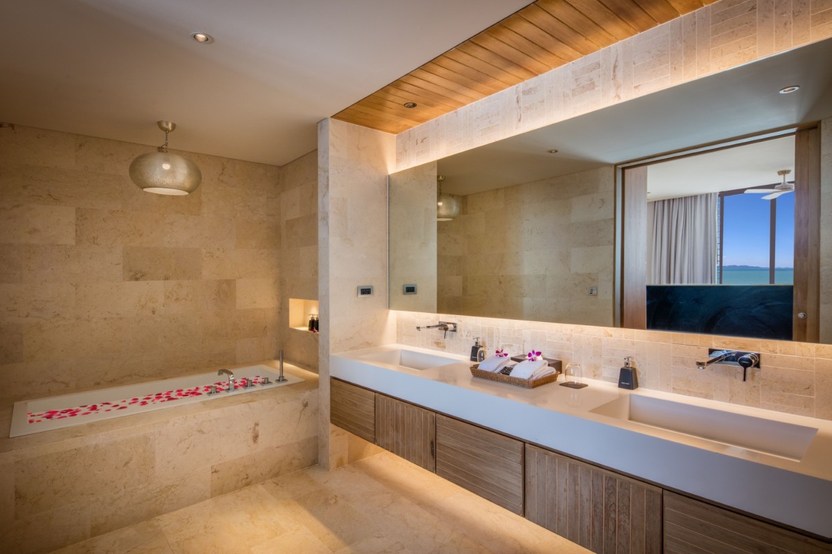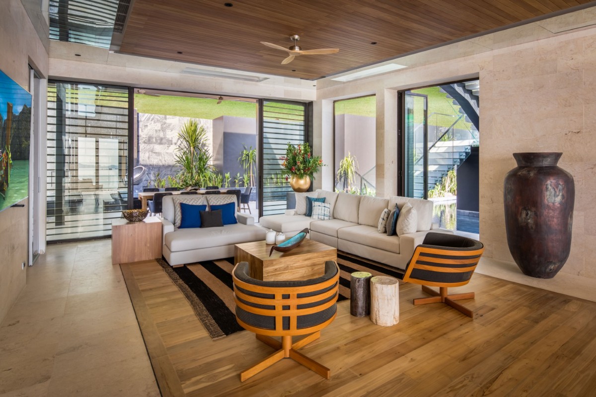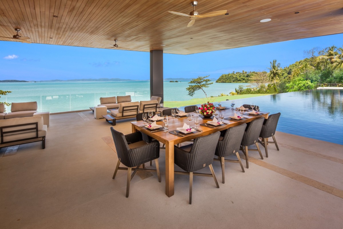 From the moment you arrive, Villa Amaravida makes an impression. Its beautifully arched entrance sets the tone for the elegance within, opening to a grand living area with soaring ceilings and exquisite design details. A dramatic floor-to-ceiling window frames sweeping views of the outdoor lounge and the sparkling Andaman Sea, offering a truly breathtaking welcome.