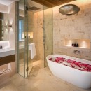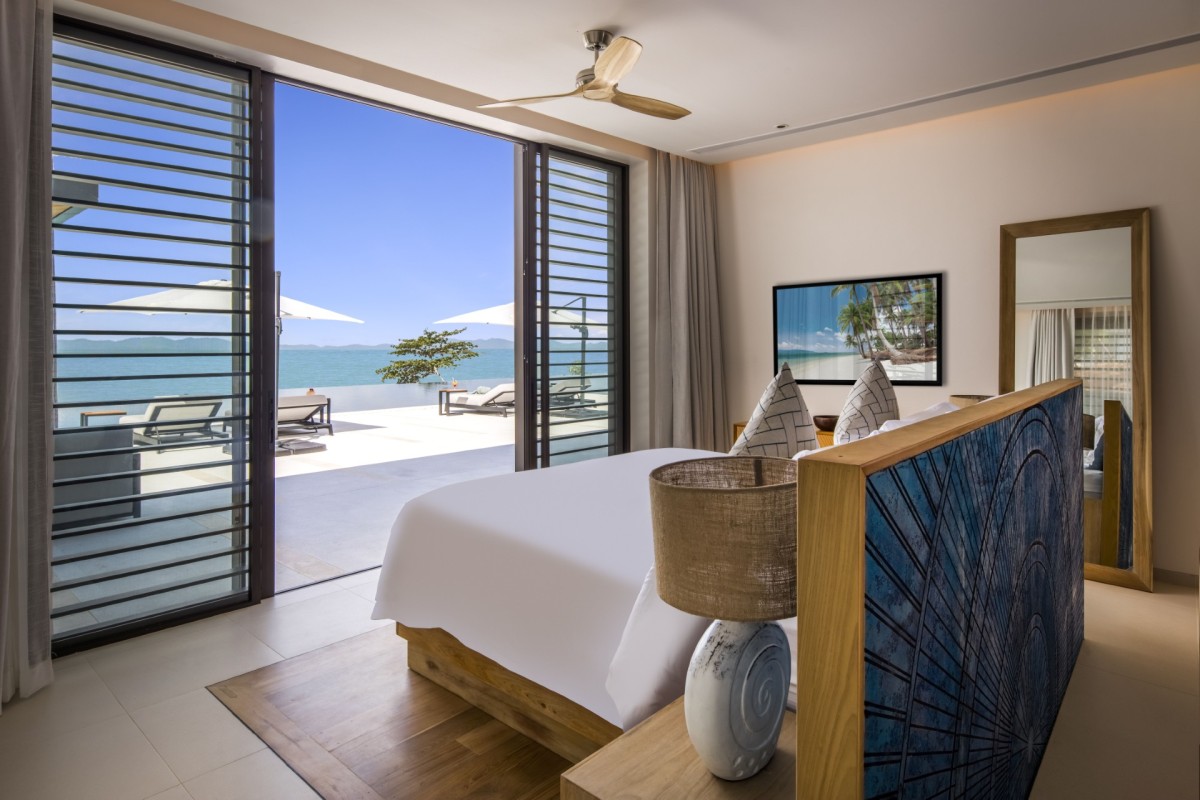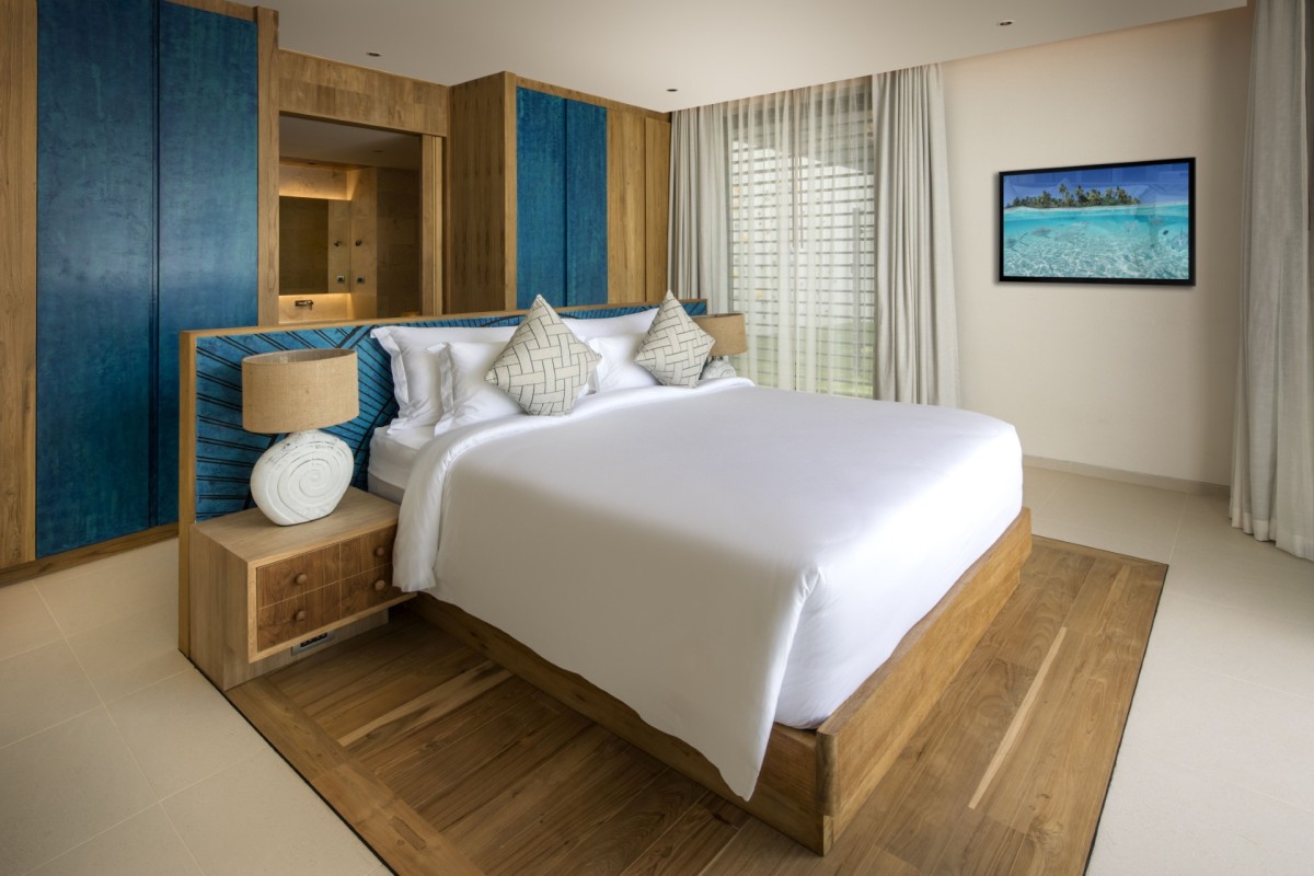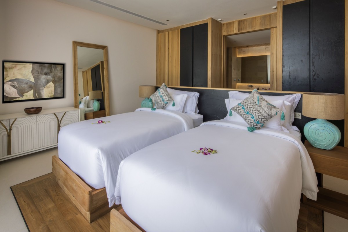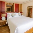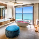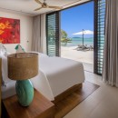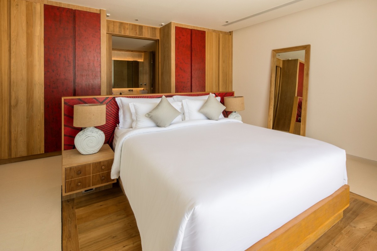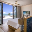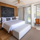 Bedroom 7: Bedroom with a king-size bed (can be made as two single beds), Smart TV, WiFi, A/C, ceiling fans, safe, her and him closet, sea and pool view, balcony, access to pool, and en-suite bathroom with bathtub, rain shower, shower, double vanity, and separate WC. 2 guests maximum