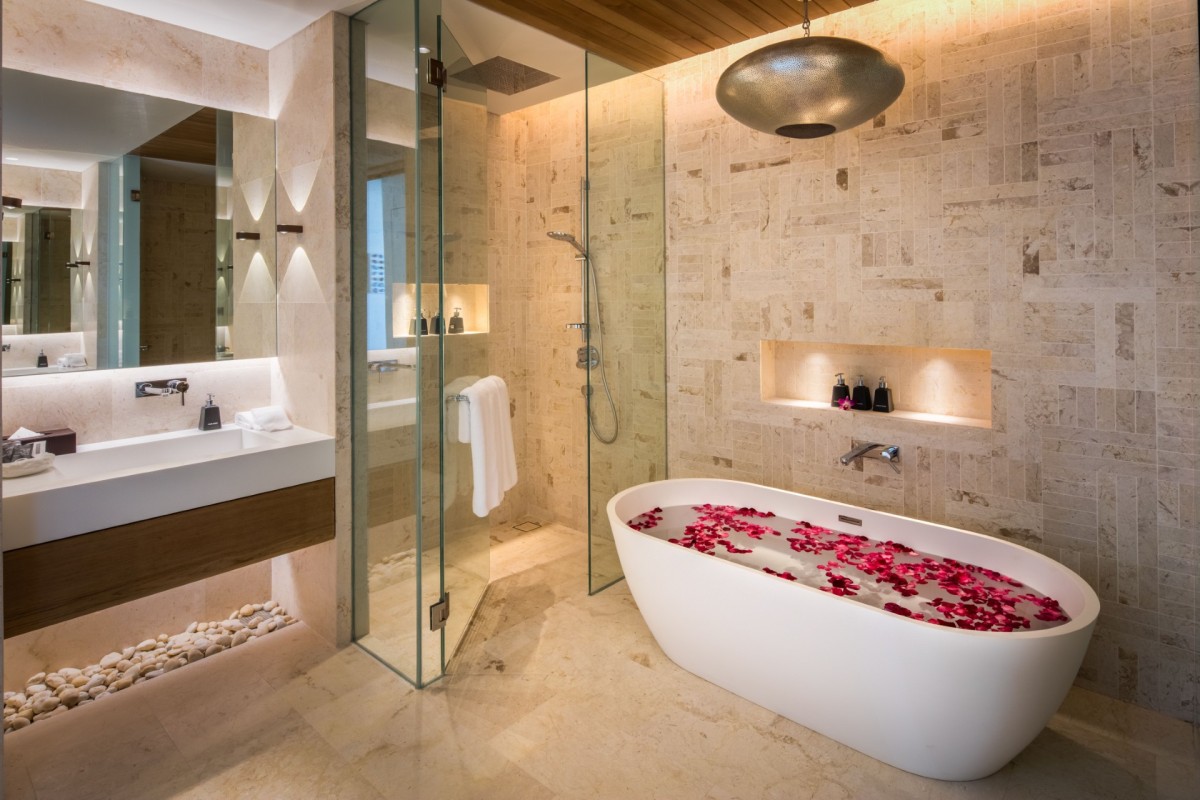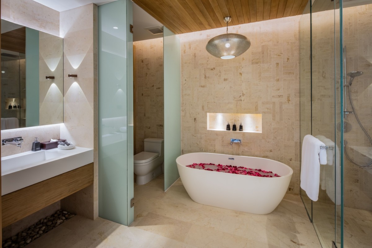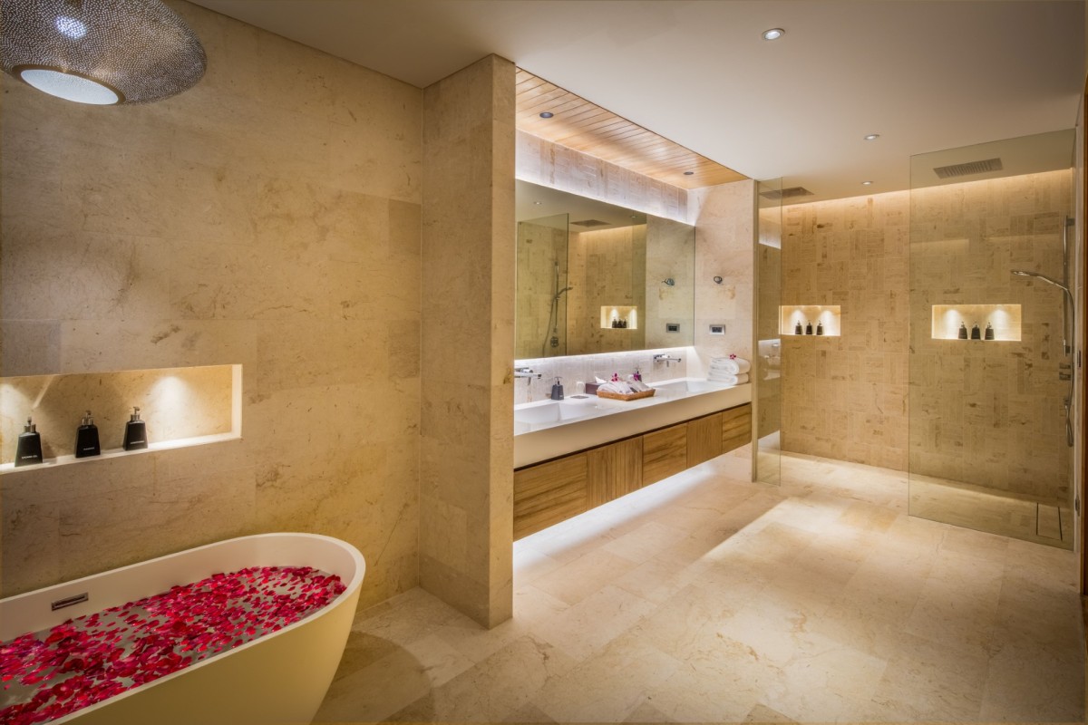 Bedroom 1: Master bedroom with a king-size bed, Smart TV, sound system, WiFi, A/C, ceiling fans, safe, walk-in closet, sea view, seating area, and en-suite bathroom with bathtub, rain shower, shower, double vanity, and separate WC. 2 guests maximum
