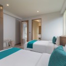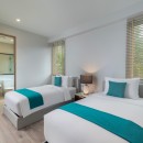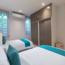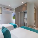 Bedroom 3: Main level bedroom with two single beds, AC, safe, and en-suite bathroom with shower, rain shower, vanities and WC with bidet. 2 guests maximum