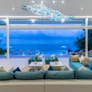 The villa’s indoor spaces are open, airy, and oriented toward panoramic sea views. A 12-seater dining table sets the stage for memorable meals, while the fully equipped kitchen and bar area—complemented by the talents of a private chef—ensure every bite is a delight. Whether gathering for dinner or enjoying a quiet cocktail, the atmosphere is relaxed and inviting.