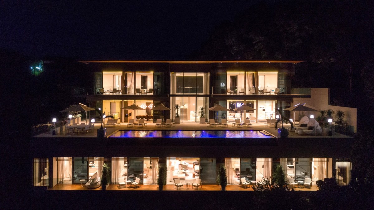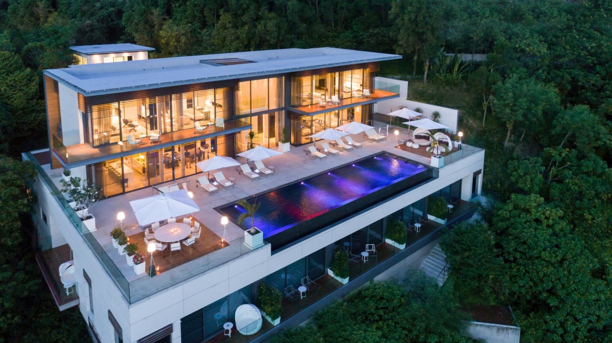 Cliff Top Residence is an extraordinary ultra-modern villa dramatically perched atop a cliff, offering breathtaking panoramic views across Ao Yon Bay on Phuket’s pristine east coast. Designed for discerning travelers, the villa features six luxurious guest suites, expansive living and entertaining spaces, two fully equipped kitchens, and a striking triple-height atrium that fills the interiors with natural light.