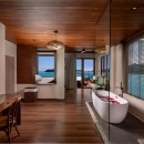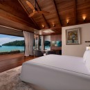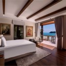 Bedroom 5: Lower level Honeymoon bedroom with king-size bed, working desk, Smart TV, AC, ceiling fan, safe, access to terrace, sea and sunrise view, and en-suite bathroom with bathtub, double rain shower, vanity and WC with bidet. 2 guests maximum
