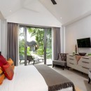 Bedroom 3: Bedroom with a queen-size bed, ceiling fan, A/C, WiFi, TV, desk, access to shared terrace, garden and koi pond view, and en-suite bathroom with rain shower, vanity, and WC. 2 guests maximum