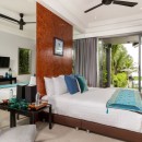 Bedroom 1: Bedroom with a queen-size bed, ceiling fan, A/C, WiFi, TV, access to pool terrace, ocean view, and en-suite bathroom with shower, vanity, and WC. 2 guests maximum