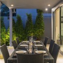 The open-plan living area invites the ocean breeze in, seamlessly connecting to a spacious terrace equipped for alfresco dining and lounging. An air-conditioned dining room and a fully equipped modern kitchen provide indoor options for meals and gatherings.