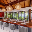 Adjacent to the kitchen, the expansive dining area provides an elegant setting for intimate dinners or lavish gatherings, with panoramic views of the pool, ocean, and enchanting sunsets serving as the backdrop for unforgettable dining experiences.