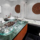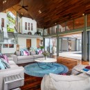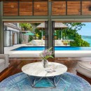 Step into the villa through its dramatic entrance, featuring an indoor balcony that allows you to admire the entire tropical interior in all its grandeur. Vibrant rugs, contemporary art, and sculptures add a touch of excitement and complement the villa's allure.