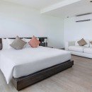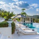The villa's architecture blends modern minimalism with touches of Thai design, incorporating the iconic Thai-style pointed roof. The interior decor seamlessly fuses modern chic with traditional elements. The overall design features clean white walls adorned with stylish furnishings and artworks. Upon entering, guests are welcomed into a spacious living area featuring plush sofas, marble Buddha statues, and a stunning ocean view. Just steps away, the outdoor pool provides a relaxing oasis with panoramic views of the surrounding natural beauty.