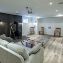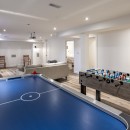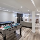 On the lower level, unwind in the recreational room equipped with a couch, wood stove, chairs, and a table. Entertainment options abound with a projector and screen for movie nights and a game table for friendly competitions.