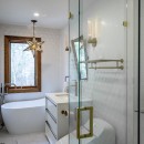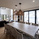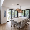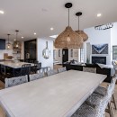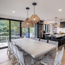 Inside, the main level offers a well-appointed kitchen with high-end appliances and a spacious island that seats six. The adjacent dining room, with seating for ten, is open-concept and flows seamlessly onto the deck, making it perfect for family meals or entertaining guests.