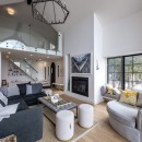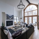 The living room provides a comfortable retreat with ample seating around a cozy gas fireplace and large windows offering panoramic lake views. It also offers direct access to the deck, enhancing the indoor-outdoor living experience.