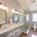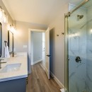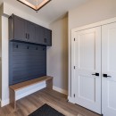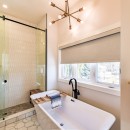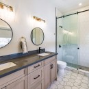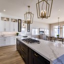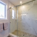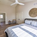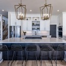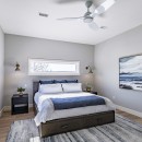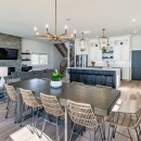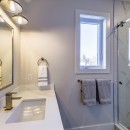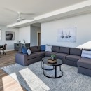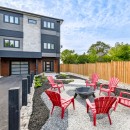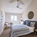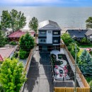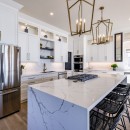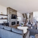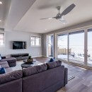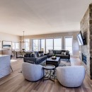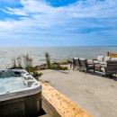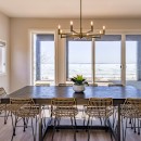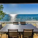 Inside, the beach house exudes modern elegance with its high-end kitchen appliances, a generous island with seating for five, and a convenient walk-in pantry. The open-concept dining room accommodates up to twelve guests, offering sweeping lake views, while the adjacent great room invites you to relax by the gas fireplace amidst plush seating.