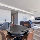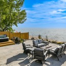 For indoor entertainment, the lower level rec room provides a retreat with its L-shaped sofa facing the waterfront and a TV for movie nights. A cards table and mini bar complete the space, ensuring comfort and enjoyment even on rainy days.