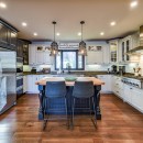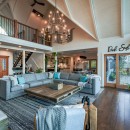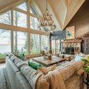 The main floor of the cottage features soaring 40-foot cathedral ceilings, a massive fieldstone fireplace, and floor-to-ceiling windows that frame the panoramic lake views. This open-concept design creates a bright and airy space, ideal for relaxation or entertaining. The newly updated kitchen boasts state-of-the-art appliances, including a GE gas stove and a large island, perfect for casual meals or hosting guests. A cozy media room with a 120" projector screen and the luxurious screened-in Muskoka Room add to the home's entertainment features, making it a place for every season and occasion.