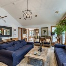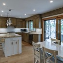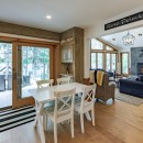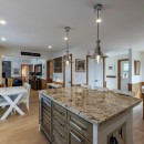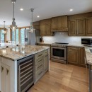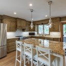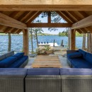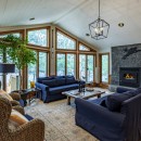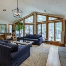 Inside the main cottage, the kitchen features brand new high-end appliances, custom cabinets, and granite counters. The island seats four and includes a temperature-controlled wine fridge, while a custom dining table for ten matches the elegant cabinetry. Patio doors from the kitchen lead out to the expansive deck overlooking the water. The open-concept living room on the main floor offers oversized couches arranged around an airtight wood insert and a striking floor-to-ceiling castle stone chimney.