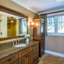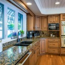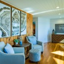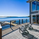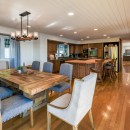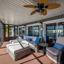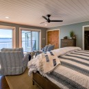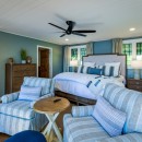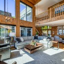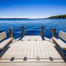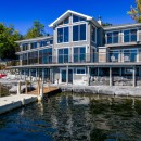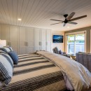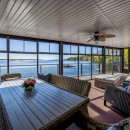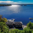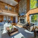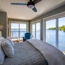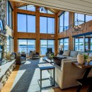Inside the main cottage, the kitchen boasts stunning panoramic lake views, complete with a spacious island and high-end appliances. The open-concept dining room comfortably accommodates gatherings of up to 10 people, with additional seating available in the sunroom. Floor-to-ceiling windows in the great room frame breathtaking lake vistas, complemented by a striking 16-foot stone fireplace and a cozy L-shaped sofa, creating a perfect spot to relax after a day of lakeside adventures. For bug-free dining and lounging, the fully screened sunroom offers a serene retreat.