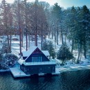 At the water's edge, a splendid boathouse and dock beckon, furnished with ample outdoor seating and featuring clear glass railings for unobstructed views of the picturesque Lake Joseph. Explore the expansive 12-acre property fully by strolling along the trails traversing from the highway to the water, complete with a meandering river.