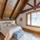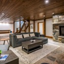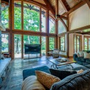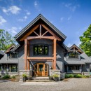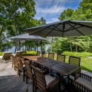 A drive through the woods leads you to a circular driveway enveloping the front yard. Enter through a majestic portal adorned with timber beams, setting the tone for the cottage's grandeur. Out back, discover a charming dining area for six, shaded by two umbrellas and equipped with a BBQ, ideal for leisurely lunches. Additionally, indulge in relaxation with three loungers and a hot tub overlooking a cascading stone staircase. To the left, three kid pod hammock chairs sway gently in the summer breeze, offering a playful retreat. A fire pit with stone seating for six awaits on the right, perfect for cozy marshmallow roasting as twilight descends. Further along, three tire swings beckon, providing a whimsical vantage point to soak in the breathtaking vista.