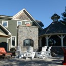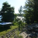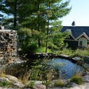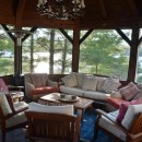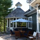 Upon entering through the stone gateway and down the paved driveway, visitors are greeted by a sprawling 6000-square-foot lakefront estate. The property features a charming turret-style "Muskoka room," a whimsical tree fort, and various thoughtfully positioned structures, all contributing to its distinctively private ambiance. Stone pathways and expansive decks offer ample space for relaxation, sunbathing, cooking, and enjoying the unparalleled views, along with a quaint in-ground pool for added leisure.