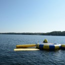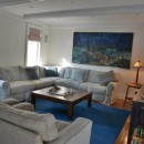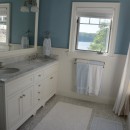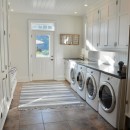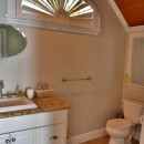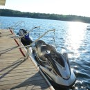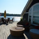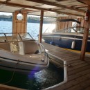 In addition to accommodating three boats and providing an outdoor shower, the boathouse boasts an additional luxury living area. This secondary space, equipped with air conditioning, includes a queen bedroom and a second bedroom with two double beds. Guests can indulge in the luxury of the granite vanity bathroom, featuring a glassed-in shower.