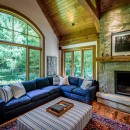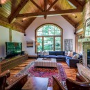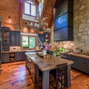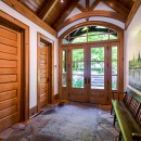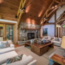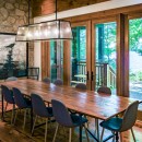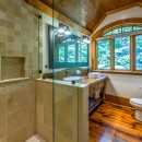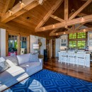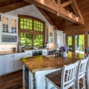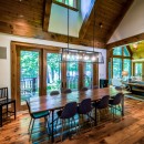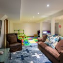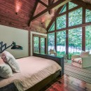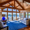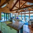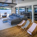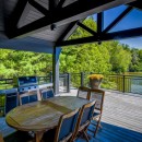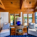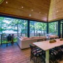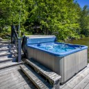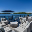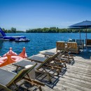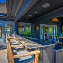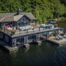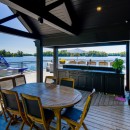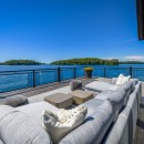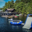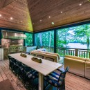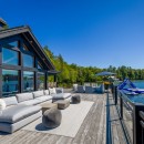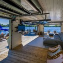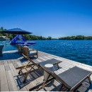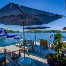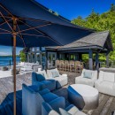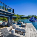Continuing along the walkway, you'll find the boathouse and hot tub awaiting your enjoyment. The expansive deck includes a shaded dining area for 6, a wet bar with seating for 5, and a BBQ. An oversized outdoor couch and additional seating areas provide ample relaxation space, complemented by 8 outdoor club chairs under an umbrella. The lower-level boathouse deck offers a sectional couch, 2 chairs, and 3 interior slip boathouse seats. Outside, 4 lounge chairs invite sunbathing while overseeing kids sliding down the Aquaglide play structure.
