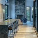 The open-concept dining room features a Live Edge Oak table, exuding rustic charm and elegance. With seating for 8-10, it's the perfect setting for memorable gatherings and intimate dinners overlooking the lake. Unwind in the grandeur of the great room, adorned with a floor-to-ceiling Muskoka Stone wood-burning fireplace. Sink into the plush seating, including a cozy 3-seater couch and swivel loungers, and immerse yourself in the serene ambiance while enjoying captivating views of the fire.