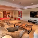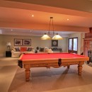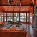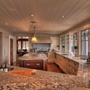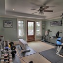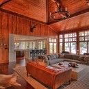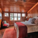 The cottage further comprises two private upper-level bedroom wings, each with its own bathroom facilities. Descend to the lower level, where a cottage game room awaits, complete with a professional pool table and two seating areas adorned with a large TV and wood-burning fireplace. Additionally, a fully-equipped gym, bedroom, and bathroom offer further indulgence.