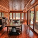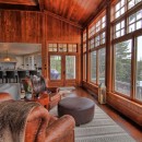 Step inside to discover an inviting interior adorned with a double vaulted wooden ceiling, embraced by floor-to-ceiling windows that frame panoramic views. A majestic stone wood-burning fireplace commands attention in the spacious lounge area, offering a cozy retreat. Adjacent lies an open-concept kitchen, equipped with top-of-the-line amenities including a Subzero fridge and professional gas range oven, perfect for culinary enthusiasts.