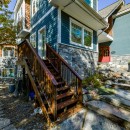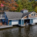 Granite steps lead down to the 3-slip boathouse and docks, where resin chairs and umbrellas await. An additional dock provides more seating. The waterfront offers a shallow, sandy walk-in area suited for smaller children, while deeper waters extend to 6 feet off the dock. Nestled in a quiet bay in the Narrows, the cottage is an ideal spot for kayaking, canoeing, and waterskiing, with convenient access to the expansive lake just around the bend.