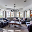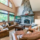 The kitchen is open-concept, connecting seamlessly to the dining and great room. It features Kitchenaid appliances, 2 ovens, a beverage station, large pantry, granite counters, and a spacious island that seats 4. This sizable dining room boasts custom windows that can be pulled down to transform the space into a screened-in Dining/Muskoka room. It accommodates a large dining table comfortably seating 8, with capacity for up to 10 guests, and offers direct access to the deck. A spacious, open-concept area featuring a cut stone fireplace with a wood mantle, a wall of windows, and high, open ceilings. Furnishings include 2 large leather sofas, 2 chairs, and a large TV.