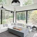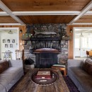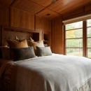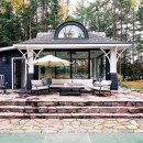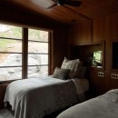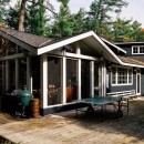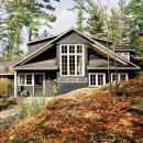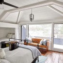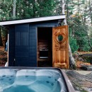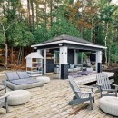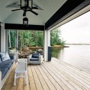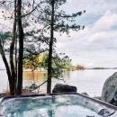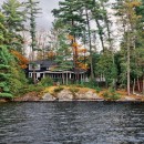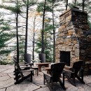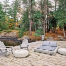 A short stroll uphill from the boathouse brings you to the west and southwest-facing bunkie, offering two bedrooms, a green roof, an outdoor shower, and a spacious outdoor gathering area with sunset views, a large fireplace, and a propane BBQ.