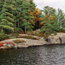 Further on lies a sprawling peninsula with a raised granite point that offers expansive views southward into the bay and westward over the open lake, perfect for watching stunning sunsets. Returning towards the large boathouse, another bend in the path leads through an ancient forest to the island's wilder upper half, featuring elevated viewpoints and peaceful seating areas.