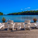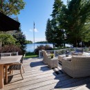 The main cottage impresses with a kitchen boasting granite countertops, high-end appliances, and a spacious island. Adjoining the kitchen, the dining area accommodates 8 guests and opens onto the deck spanning the waterfront. The living room captivates with floor-to-ceiling windows framing breathtaking Lake Muskoka views, complemented by cozy sofas around a stone gas fireplace. A separate family room adds extra comfort with sectionals and another fireplace.