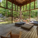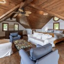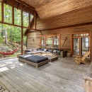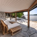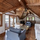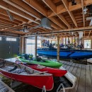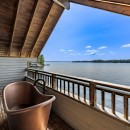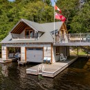 Ascend to the boathouse's upper level and find an open concept living space complete with a king-size bed, bar, sink, and a small powder room featuring a copper tub on the private deck. The main deck here offers seating for over ten and breathtaking views of Lake Muskoka. The lower level of the boathouse features additional amenities, including three boat slips (two within the boathouse), a sauna, and a covered boat slip for convenience.