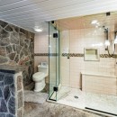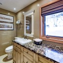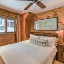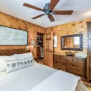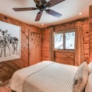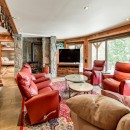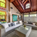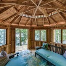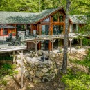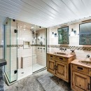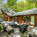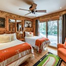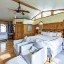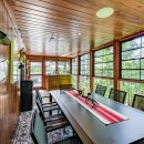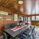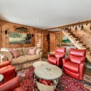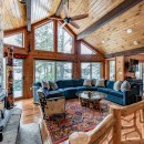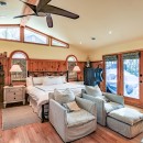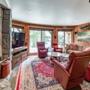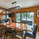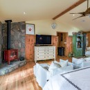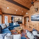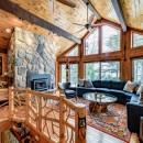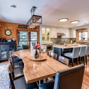 The open-concept dining room boasts a magnificent live edge wood table that comfortably seats ten, complemented by a smart TV that can swing between dining and living areas, blending convenience with relaxation. In the great room, unwind beside a towering stone wood-burning fireplace, surrounded by a large L-shaped sofa and floor-to-cathedral ceiling windows that flood the space with natural light.
