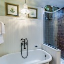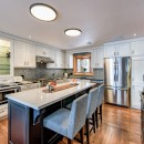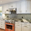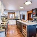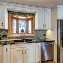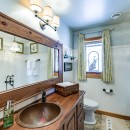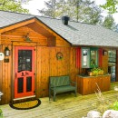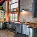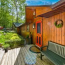 Inside the main cottage, the kitchen is a chef's dream with striking black granite countertops, high-end stainless steel appliances including a commercial gas stove, and an island with seating for three. A coffee bar features two Nespresso machines, a Keurig, and a hand-made backsplash, ensuring every culinary need is met with style.