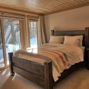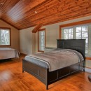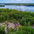 Amidst the peaceful ambiance, the gentle sound of a nearby stream accompanies moments of leisure on the deck. Families will appreciate the expansive, level grounds leading to the south-facing sandy beachfront, boasting over 500' of shoreline. Two Muskoka chairs beckon on steps down to the beach, offering perfect spots to soak in the scenery.