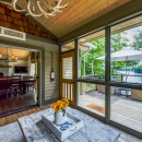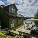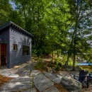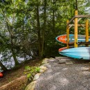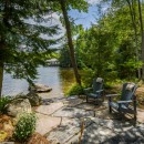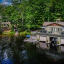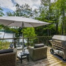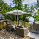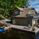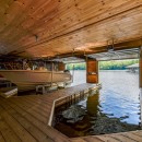 A recently renovated boathouse awaits on the left, featuring upper-level living quarters and an elevated sundeck with four loungers for sunbathing. With three interior slips, including one for visitors' watercraft, the boathouse deck is furnished with a teak table, chairs, umbrella, loungers, and Muskoka chairs, perfect for lakeside relaxation.