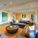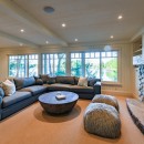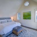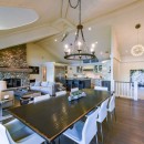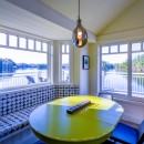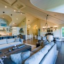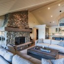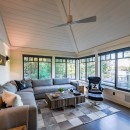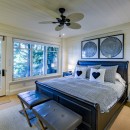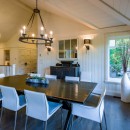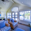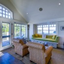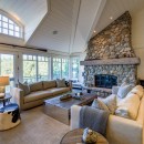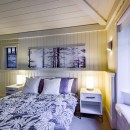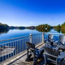 Inside the main cottage, you’ll find six beautifully appointed bedrooms, ensuring ample space for family and friends. The kitchen is a chef’s dream with high-end stainless steel appliances and a spacious island. The open-concept dining room comfortably seats ten and offers stunning views of the lake, perfect for sunset dinners. The great room features a cozy stone fireplace and plush sofas, bathed in natural light from large windows. The Muskoka Room, with its oversized sofa and screened windows, invites you to relax while enjoying the summer breeze.