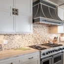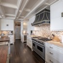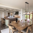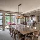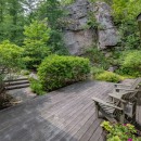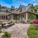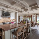 Inside, the main level boasts a chef's kitchen equipped with high-end Viking appliances, including a gas stove, two full fridges/freezers, and a pantry with dishwasher drawers and a microwave. The kitchen features a spacious wood island with seating for five, making it a perfect gathering spot. The dining room accommodates ten and opens up to a stone terrace with an outdoor dining area and a gas BBQ for alfresco meals. The great room is designed for relaxation, featuring a wood-burning fireplace, cozy sofas, and inviting chairs.